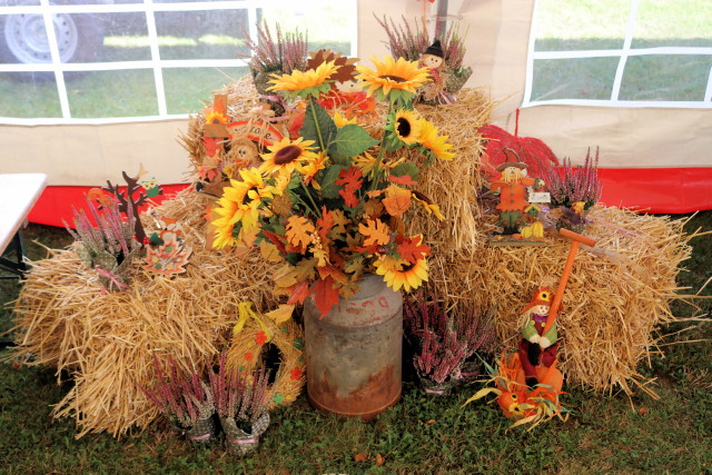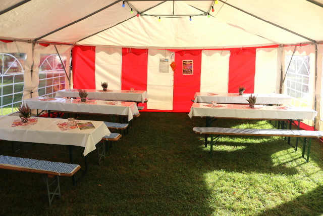 Die Zeltdekoration ist herbstlich gehalten, obwohl es draußen noch sommerlich warm und sonnig ist.