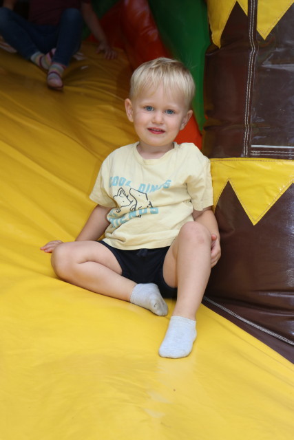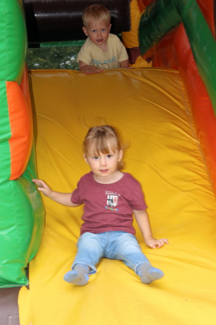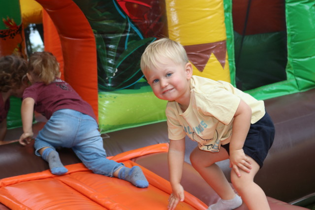 Kinder auf der Hüpfburg herumtoben.