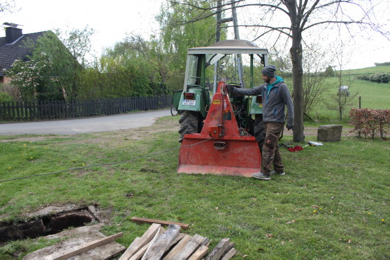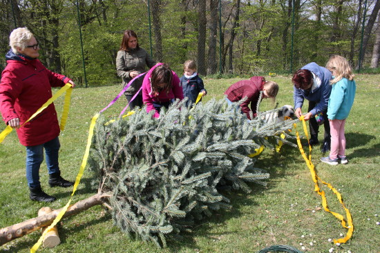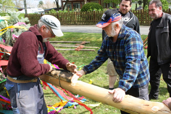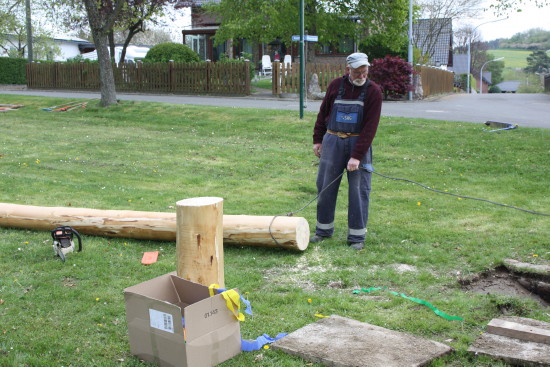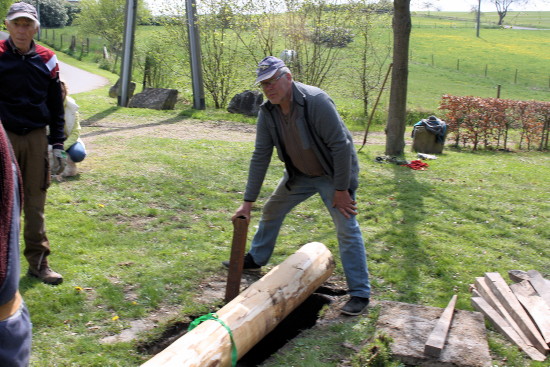 Stückchen für Stückchen wurde der Baum mit schierer Muskelkraft, Hebelstangen und einer handbetriebenen Seilwinde ins Lot gesetzt. [ Seite 1 | Seite 2 ] Zurück zur Seite "Dorfgemeinschaft"
