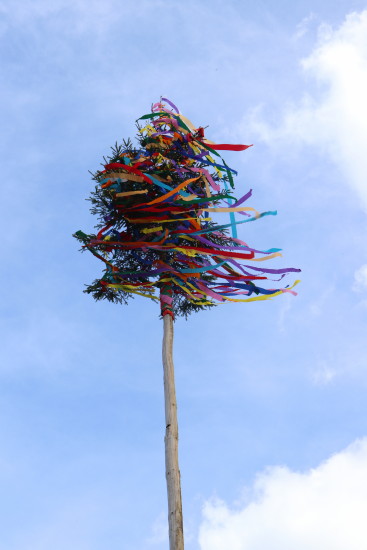 Maibaum vor blauem Himmel.