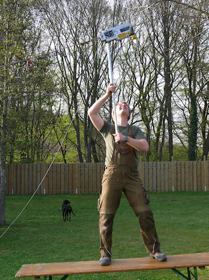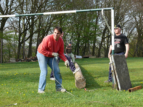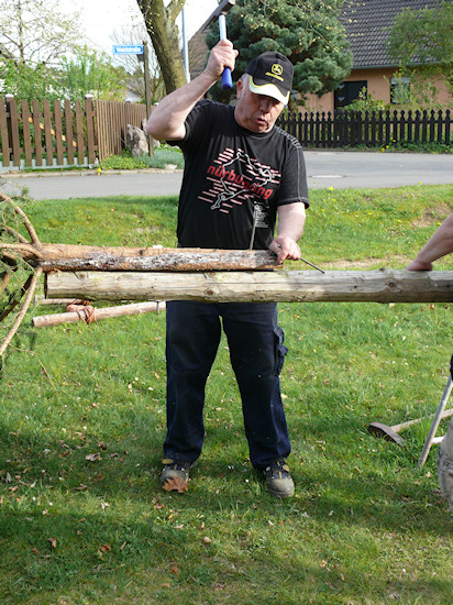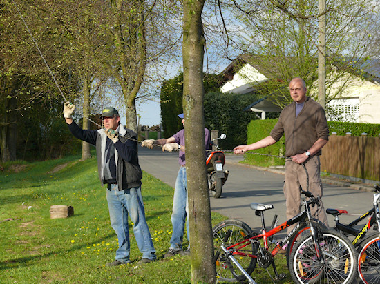 Mit Seilwinde und Muskelkraft wird der Stamm im Position gebracht.