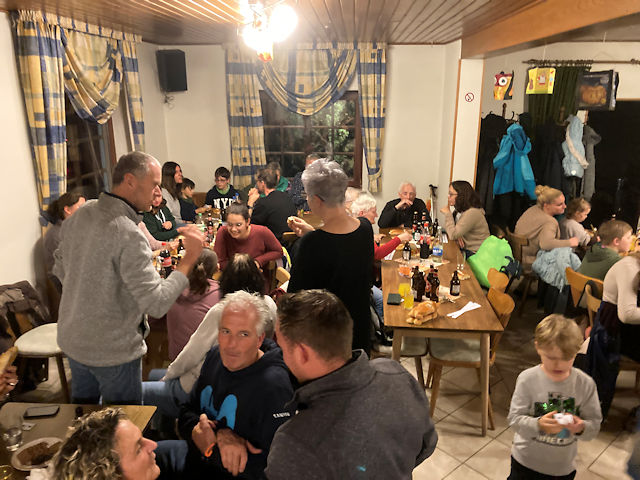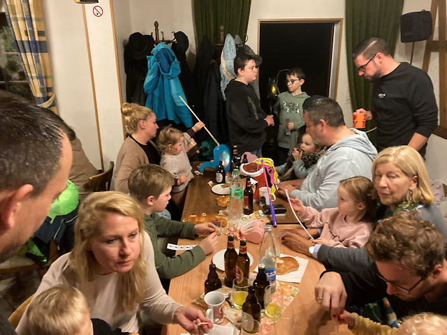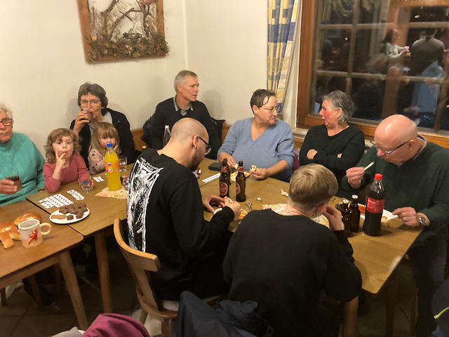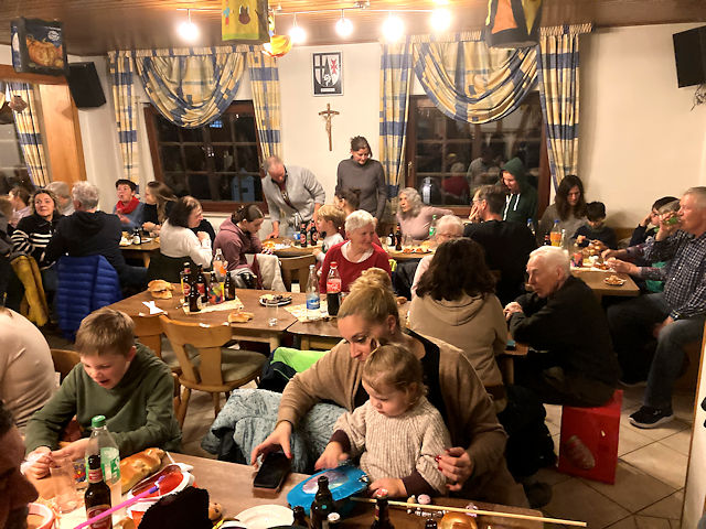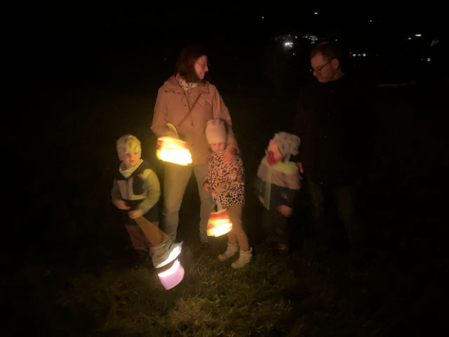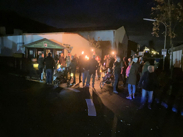 Martinszug und Martinsfeuer 2025mit gemütlichem Beisammensein und Verlosung im GemeindehausSamstag, 15. November 2025 Großer Andrang herrschte in diesem Jahr. Das Wetter war zwar in den letzten Tagen schöner als ausgerechnet an diesem Samstag. Aber zumindest zu Beginn war es tgrocken und dazu ungewöhnlich mild. Da störte es auch nur wenig, dass es ausgerechnet anfing zu regnen, als wir am Martinsfeuer standen. Schließlich wartete ja das trockene Gemeindehaus. Wie in jedem Jahr sicherte die Freiwillige Feuerwehr unter Wehrführer Tobias Lussi den Umzug. Das Blasorchester Insul sorgte für die gekonnte musikalische Begleitung, ohne die ein Martinszu nicht vorstellbar ist.