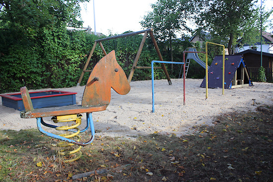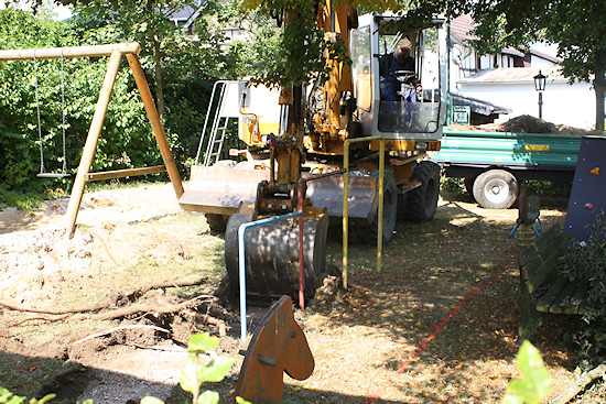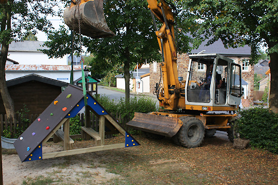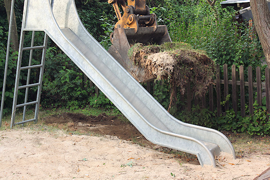 Damit der riesige Bagger überhaupt arbeiten konnte, musste erst das Tor samt Pfosten entfernt werden. Um den Sicherheitsanforderungen für Spielplätze gerecht zu werden, muss ohnehin ein neues Tor angebracht werden.