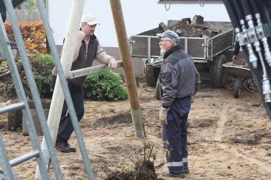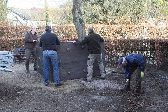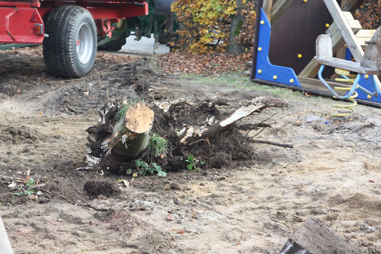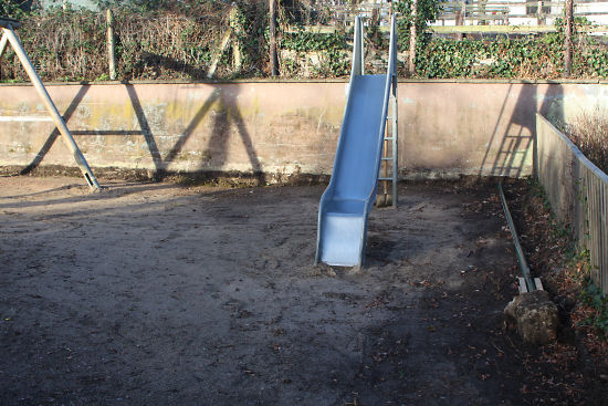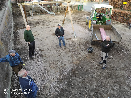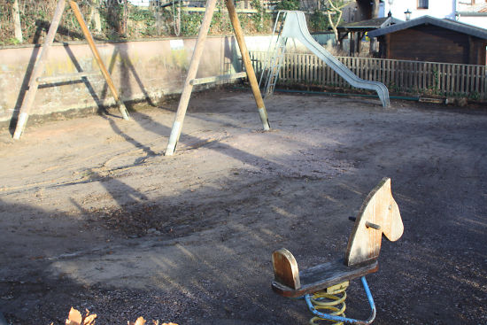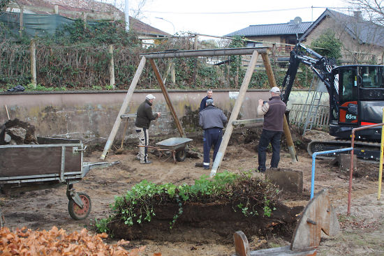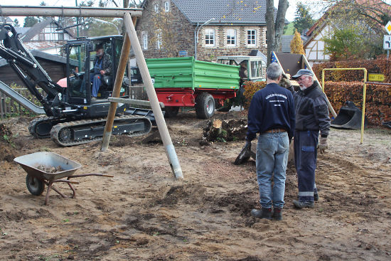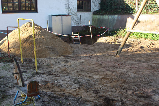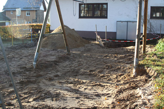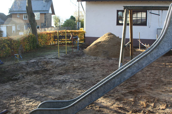 Erneuerung des Sierscheider Spielplatzes2020 bis 2021[ 2013 | Seite 1 | Seite 2 | Seite 3 ] Nach der Spielplatzerneuerung 2013 und dem zwischenzeitlichen Austausch des Eingangstores nach neuesten Sicherheitsbestimmungen sah der Spielplatz 2020 nicht mehr sehr ansehnlich aus. Außerdem ist jetzt eine jährliche Sicherheitsüberprüfung durch den TÜV vorgeschrieben. Und der hat immer etwas zu meckern. Aus Spendengeldern des Sierscheider Opernsommers, unseres Jagdpächters und später noch von Innogy sollte eine grundlegende Erneuerung erfolgen. Hierzu musste der gesamte alte Sand entfernt werden. Im Zuge dieser Arbeiten wurde auch eine Grube für einen Erdgastank ausgehoben, der zur Beheizung des Gemeindehauses dienen soll. Im November 2020 begannen die Arbeiten mit der Entfernung des Sandes und des Bewuchsstreifens entlang der Stützmauer.