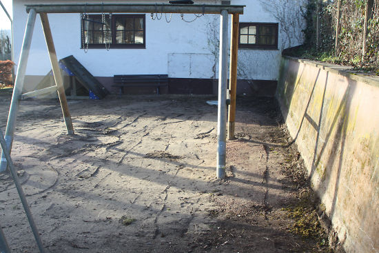 Die an der Außenwand des Gemeindehauses zu sehende Metallkiste beherbergt noch die bisherigen Gasflaschen und wird wegfallen. Rechts sieht man vor der Stützmauer noch den Grünstreifen, der aus optischen und aus Sicherheitsgründen weg muss.