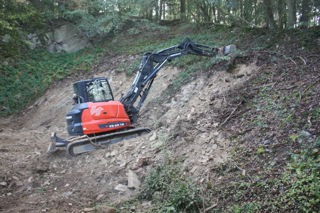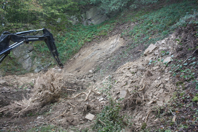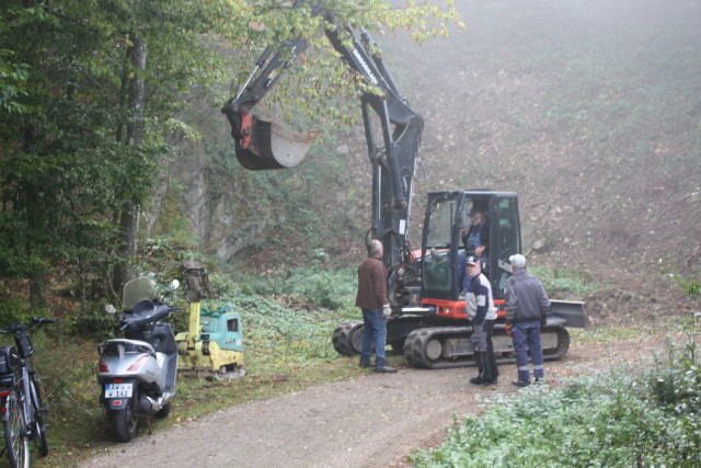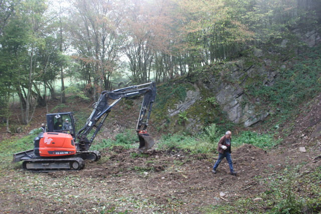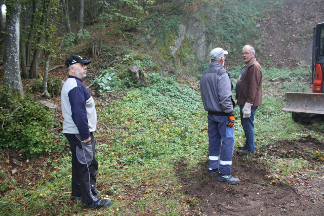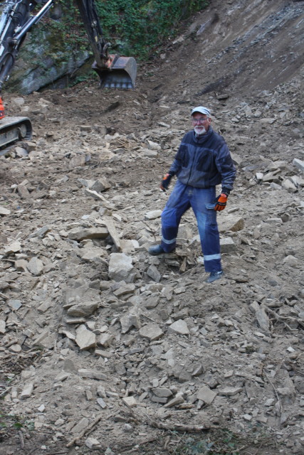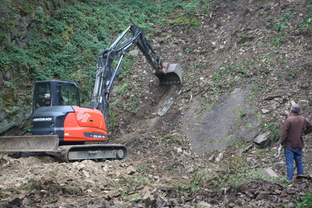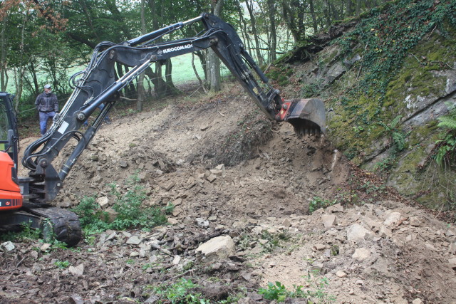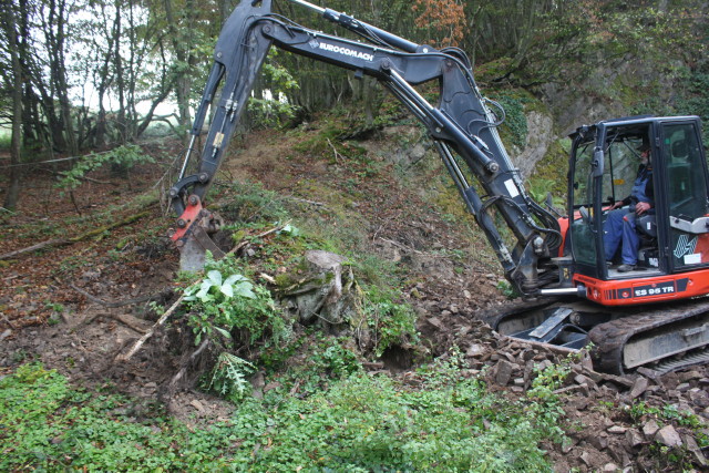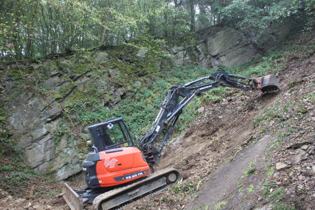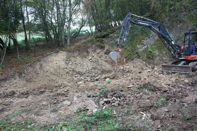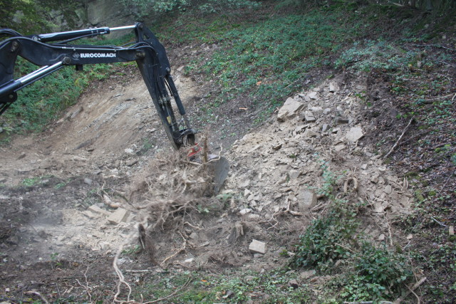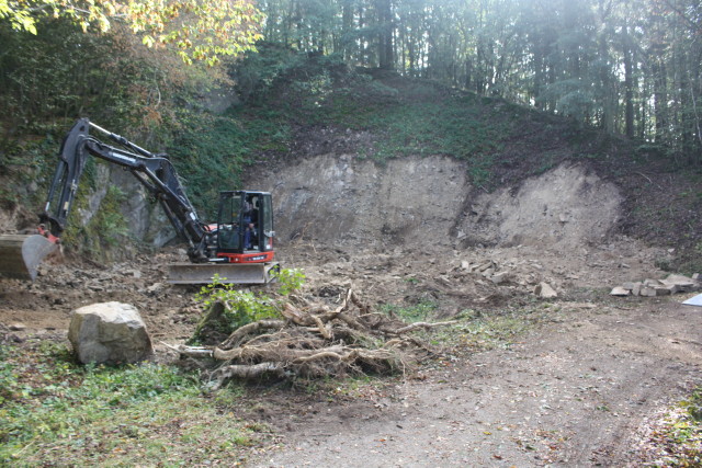 Fotos: Dirk Eßer Da ist schon eine ganze Menge Material zusammengekommen. 2023 Jetzt ging es darum, soweit möglich, die Felswände wieder sichtbar zu machen. Ende September konnte endlich, nach langen Bemühungen, der Baggerführer Berthold W. dazu bewegt werden, mit seinem Gerät tätig zu werden. Vorher mussten weitere Bäume und Wurzelstöcke beiseite geräumt werden. Der Luftsportvereins für Modellsegelflug Michelsberg e.V. hatte hierfür eine Spende zur Verfügung gestellt.