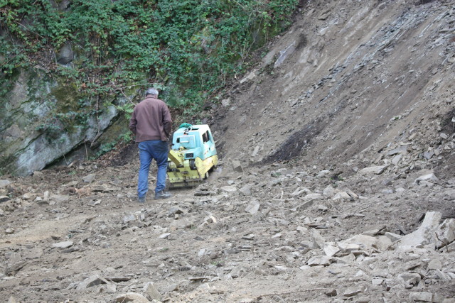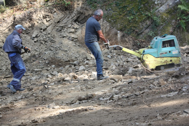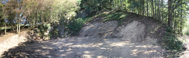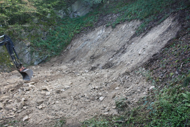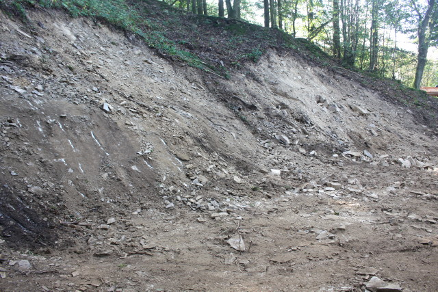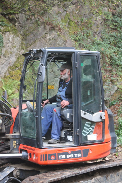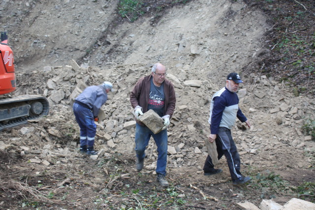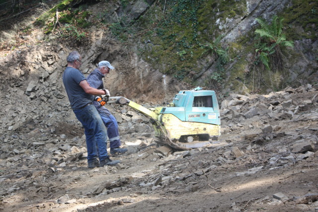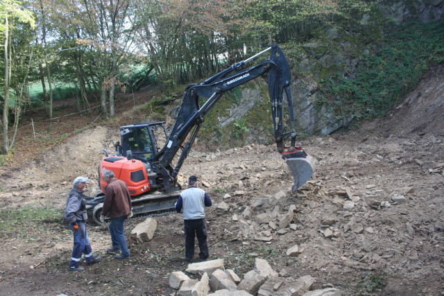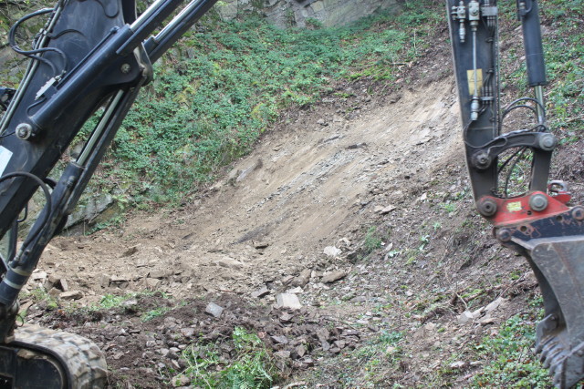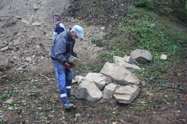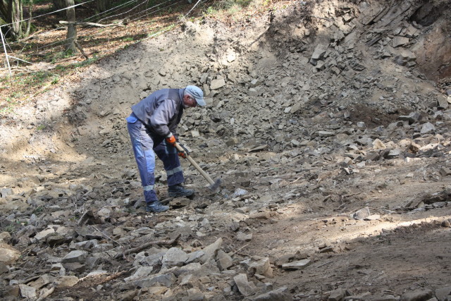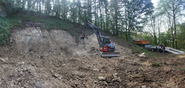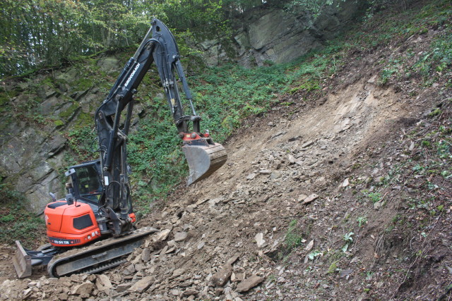 Fotos: Dirk Eßer Da ist schon eine ganze Menge Material zusammengekommen. 2023 Jetzt ging es darum, soweit möglich, die Felswände wieder sichtbar zu machen. Ende September konnte endlich, nach langen Bemühungen, der Baggerführer Berthold W. dazu bewegt werden, mit seinem Gerät tätig zu werden. Vorher mussten weitere Bäume und Wurzelstöcke beiseite geräumt werden. Der Luftsportvereins für Modellsegelflug Michelsberg e.V. hatte hierfür eine Spende zur Verfügung gestellt.