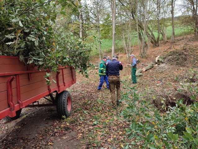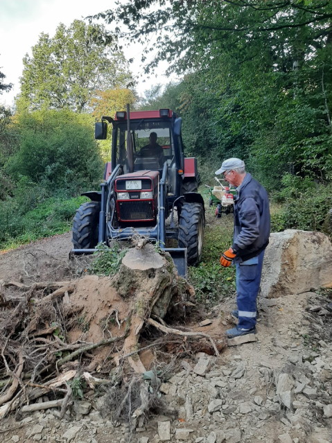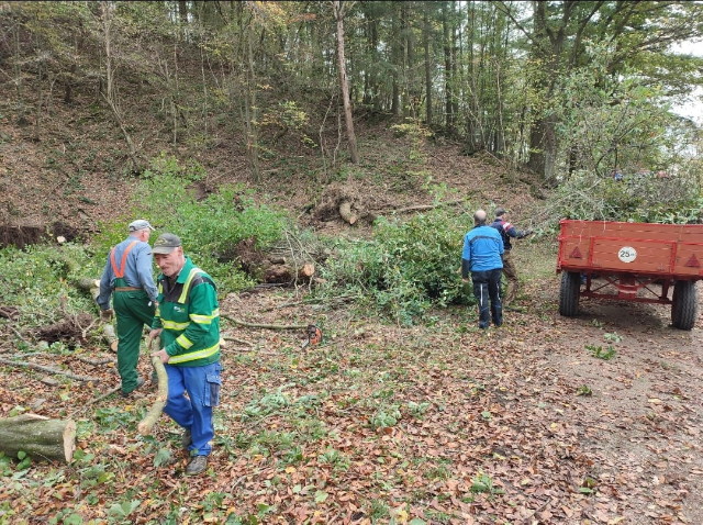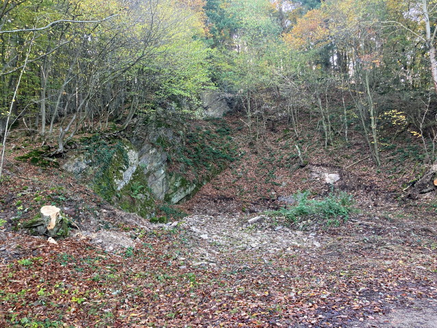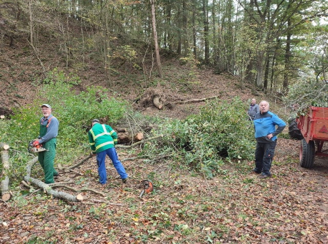 Herrichtung des alten Steinbruchsan der DümpelhardtZeugnis der Ortsgeschichte Oktober 2022 bis Oktober 2025 [ 2022 - 2023 | 2025 | Bruchsteinhäuser ] 2022 Das Vorhaben war schon länger in den Köpfen: Den am Panoramarundweg Dümpelhardt gelegenen alten Steinbruch wieder freiräumen und herrichten. Zum Einen kann man so sehr schön dokumentieren, wo das Baumaterial für die alten Bruchsteinhäuser im Dorf herkam. Zum Anderen ergibt sich eine wunderschöne, ruhige und gemütliche Ecke, die gerade im Sommer zum Verweilen einlädt. Hier ist der Steinbruch. Der Weg ist für Fahrzeuge gesperrt und als Wandergebiet ausgewiesen. Verkehrssicherungsmaßnahmen 31.10.2022 Da der Steinbruch im Laufe der Zeit ziemlich zugewuchert ist, muss zunächst die Kettensäge angesetzt werden. Das Holz, dass nicht zum Brennholz taugt, landet auf dem Martinsfeuer. Wenn später der Steinbruch begehbar sein soll, muss zuerst eine Menge Bewuchs entfernt werden. Schließlich könnte sonst jederzeit ein Baum oder Ast herunterfallen und jemanden verletzen.