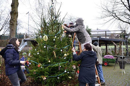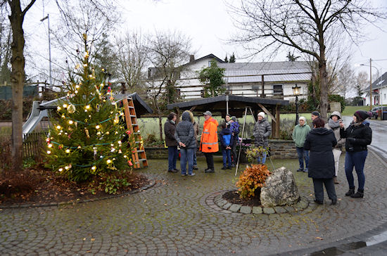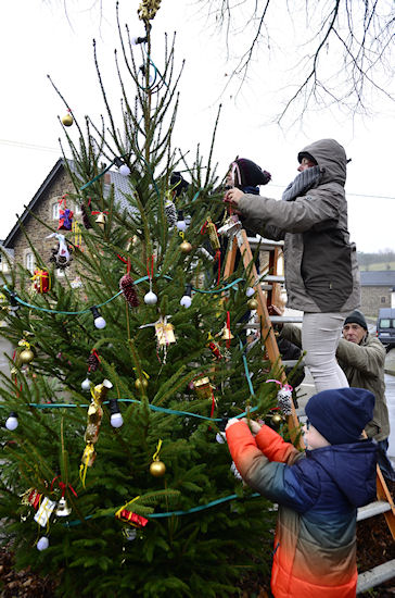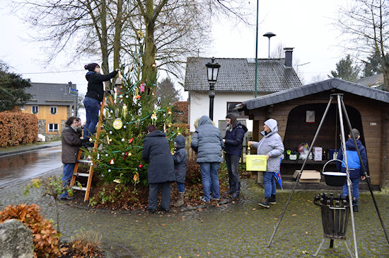 Aufstellen und Schmücken des Dorfweihnachtsbaums24.11.2018Nachdem vor einer Woche Hildegard zusammen mit den Kindern die Dekoration für den Dorfweihnachtsbaum gebastelt hatte, wurde heute der Baum auf dem Dorfplatz aufgestellt und festlich geschmückt. Unter der tatkräftigen Mithilfe der Kinder konnten wir einen wunderschönen Baum zustandebringen. Für die Erwachsenen gab es Glühwein.