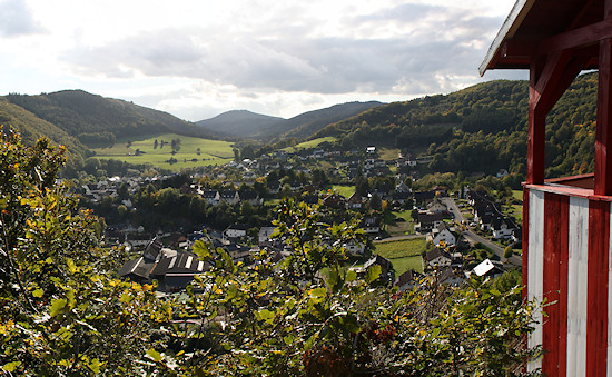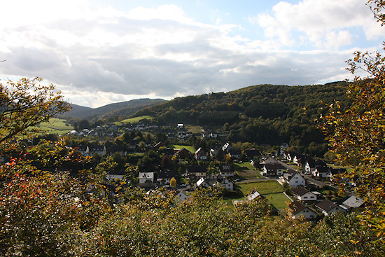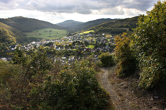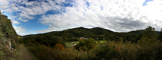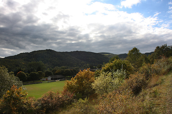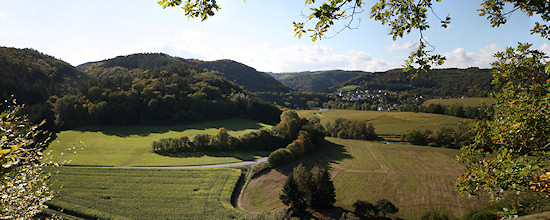 Schon bald darauf kommt man an eine Bank, von der man einen wunderbaren Blick nach Schuld hat. Wir bleiben links auf der Höhe. Danach geht es links ab hier eher sanft bergab. Sobald man as dem Wald wieder herauskommt, hat man einen freien Blick auf die umgebende Landschaft.