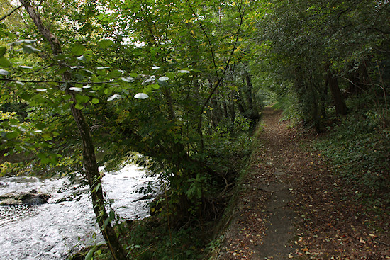 Unten biegt der Weg nach rechts ab und verläuft parallel oberhalb des Ahrtalwegs. Hier, wo das Rinnsal, das uns ein ganzes Stück begleitet hat, der Ahr zugeführt wird, kann man den unteren Asphaltweg sehen.