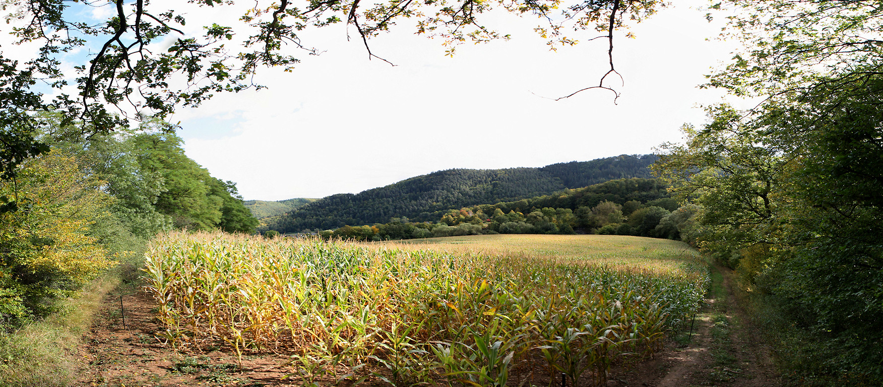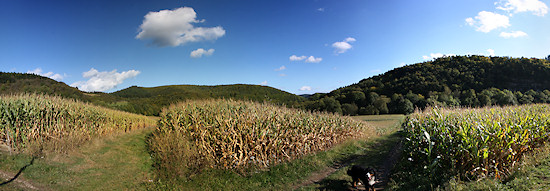 Entlang der Ahr und an diesem Maisfeld vorbei geht es jetzt bergauf wieder in den Wald hinein. Von hier kommen wir gerade.