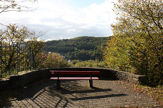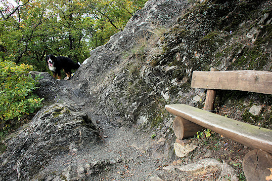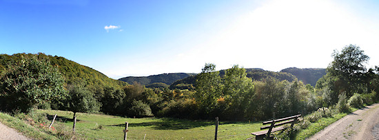 Kurz vor Ende des Aufstiegs steht noch diese Bank. Hier sollte man ein wenig verschnaufen und dabei den Blick in die Landschaft genießen. Dieses Panorama umfasst ca. 180°, daher scheint der Weg diese Schleife zu nehmen. Tatsächlich geht es hier relativ geradeaus.