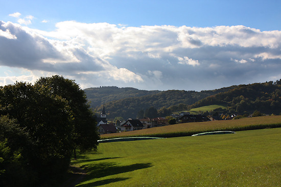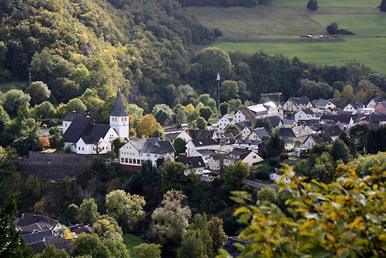 In Sierscheid kann man oberhalb der Maternuskapelle in den Ahrsteig starten. Bei typisch wechselhaftem Eifelwetter geht es los nach Insul und Schuld. Hier ein Blick auf Sierscheid mit der Kapelle im Rücken.