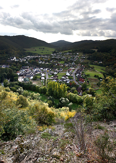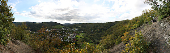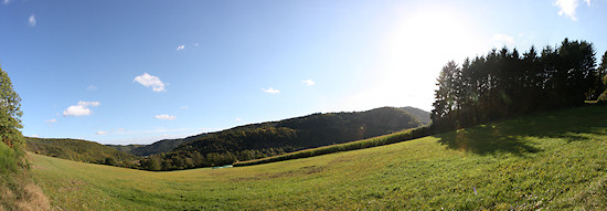 Oberhalb der Kapelle geht es nach rechts in das Tal in Richtung Insul, links zunächst auf die Dümpelhardt und von dort aus bergab in den Wald und nach Liers. Diese Fotostrecke führt uns nach Insul und weiter nach Schuld. Gleich zu Beginn hat man einen schönen Blick in das Tal. Im Vordergrund die Straße nach Insul. Manche Bilder und fast alle Panoramen kann man durch einfaches Anklicken in einem neuen Fenster vergrößert aufrufen. Drückt man dort "F11" auf der Tastatur, verschwindet das Browsermenü und das Bild wird bildschirmfüllend angezeigt. Erneutes drücken von "F11" kehrt zum ursprünglichen Zustand zurück. Dann kann dieses Fenster geschlossen werden, wodurch man wieder hierher zurück kommt.