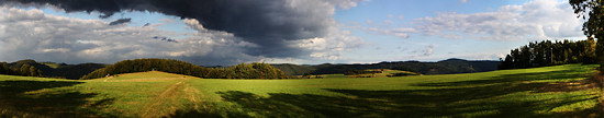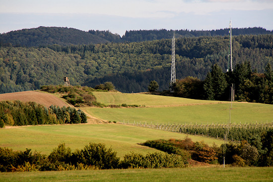 Die Dümpelhardt mit den beiden markanten Sendemasten. Links von der Kanzel (dem Hochsitz) verläuft der Ahrsteig Richtung Liers und weiter nach Lind. Eine solche Wolkenformation muss man einfach festhalten.
