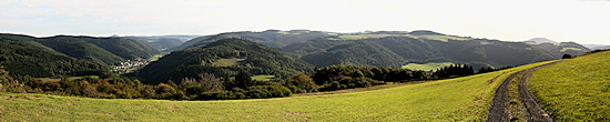 Und ganz zum Schluss noch ein Panorama von Lind aus gesehen, also ebenfalls von einer höheren Position aus gemacht. Das Panorama lässt sich durch Anklicken vergrößert aufrufen. In der großen Darstellung sieht man, wie Sierscheid und die Dümpelhardt sich in die umliegenden Berge fügen.