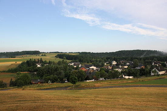 Von hier aus hat man einen guten Fernblick über Niederadenau und die Ahr-Eifel in Richtung Nürburg. Das ist übrigens nicht das Ahrtal. Die Ahr, die hier aus westlicher Richtung aus Insul kommt, vereinigt sich in Dümpelfeld mit dem aus Niederadenau von Süden her kommenden Adenauer Bach und fließt danach in nordöstlicher Richtung weiter nach Altenahr.