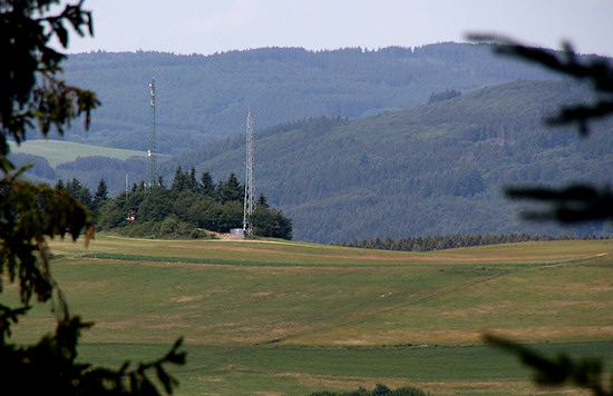 Von einem Stichweg aus kann man schon den "Gipfel" mit den markanten Sendemasten sehen. Auf diesem Foto fehlt noch der zweite, später gebaute Mast.