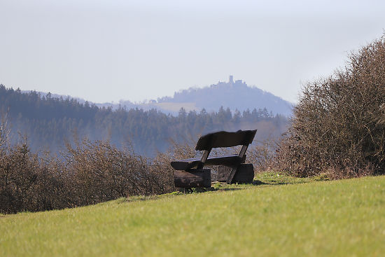 Von dieser Bank aus hat an einen wunderbaren Blick auf Niederadenau unten im Tal. Im Hintergrund thront die Nürburg.
