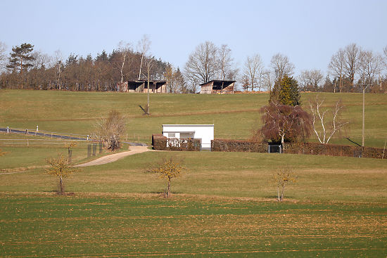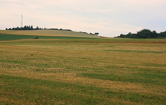 Wir gehen im Uhrzeigersinn und kommen an Wiesen und Feldern vorbei.