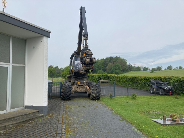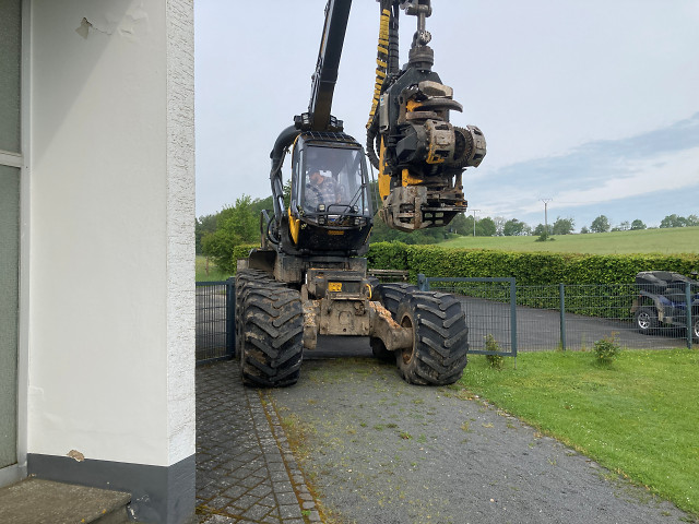 Die buchstäbliche Millimeterarbeit. Das Tor ist ziemlich genau 3m breit, der Harvester 2,95m. Macht zumindest rechnerisch 2,5cm Platz an jeder Seite.