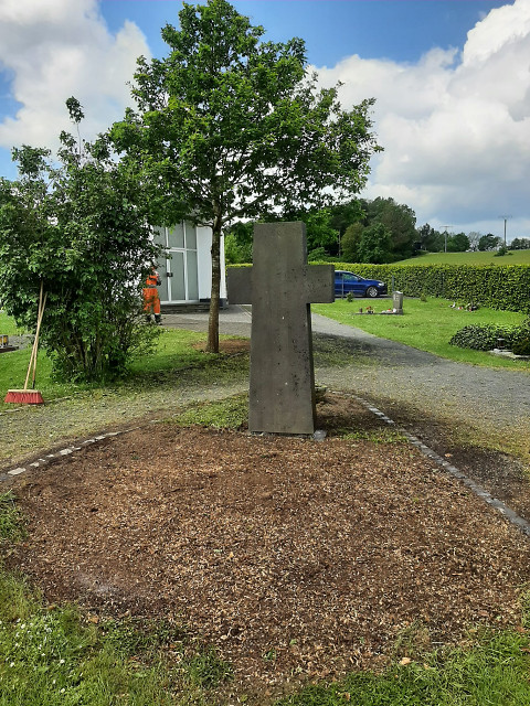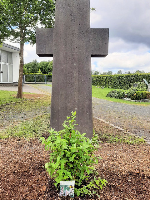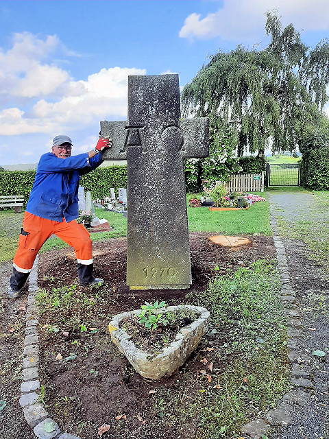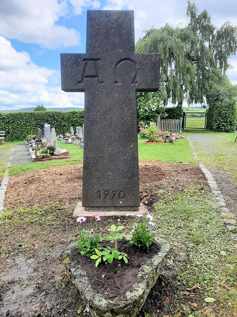 Die Hängebuche ist weg. Nachdem die Arbeit ohne Zwischenfälle und vor allem, ohne auch nur einen Kratzer an einem Grab zu hinterlassen erledigt war, konnte man das Kreuz von 1970 wieder sehen. Vor dem Kreuz stand aber noch eine Hängebuche, die den Blick versperrte. Vorher, als alles noch zugewachsen war, passte sie da gut hin. Jetzt störte sie, weil durch sie der Blick versperrt wurde. Also musste auch sie weichen, was Paul und Hermann-Josef prompt am nächsten Tag erledigt haben. Die Blumenschale, die hier zu sehen ist, stand in den Thujas direkt vor dem Kreuz. Dort kamen also weder Licht noch Wasser hin. Und gegossen hat dort mit Sicherheit auch niemand, da man die Schale weder sehen noch wirklich erreichen konnte. Und trotzdem wächst dort immer noch ein Weihnachtsstern, den man auf dem Foto sieht. Das ist sehr erstaunlich. Donnerstag