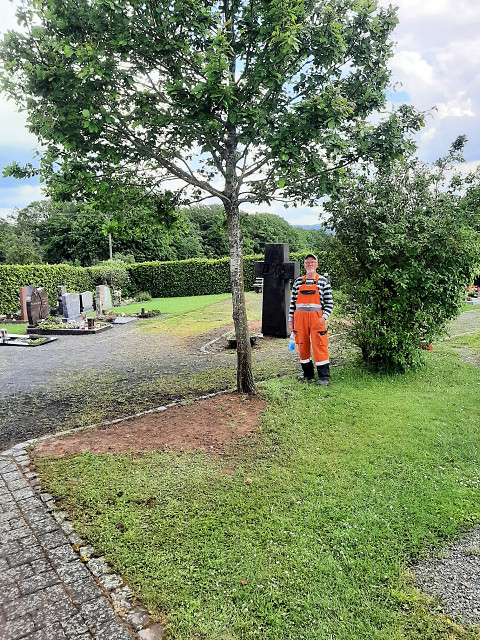 Fällen der Thujas auf dem Sierscheider Friedhof21. - 25.05.2024 Die Thujas auf dem Friedhof mussten weg. Sie waren nicht nur viel zu groß und dominant geworden, eine davon war auch abgestorben, wodurch sich die Frage der Verkehrssicherung stellte. Das Problem war, wie das Fällen zu bewerkstelligen war, ohne die Gräber zu beschädigen. Mit der Hand fällen wäre extrem schwierig und riskant gewesen. Und in eine Thuja, zumal so eine Gruppe, kann man auch nicht so einfach klettern. Also musste schweres Gerät her. Nur musste das auch zum Einsatzort gelangen. Und davor waren eine winklige Einfahrt und ein lediglich drei Meter breites Tor zu überwinden. Dienstag nach Pfingsten