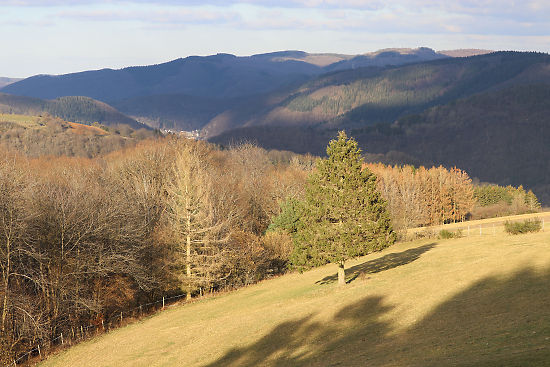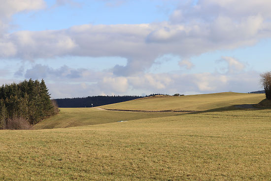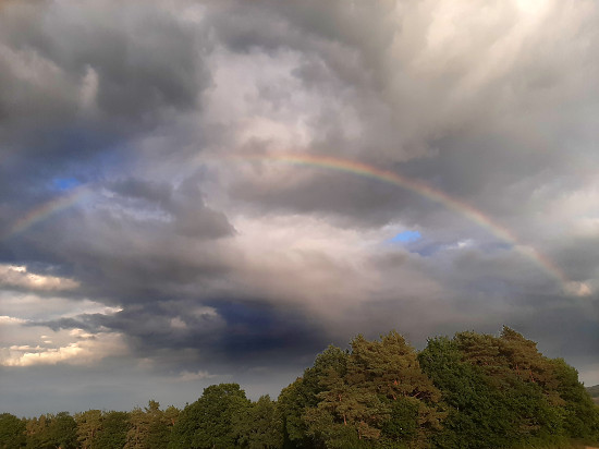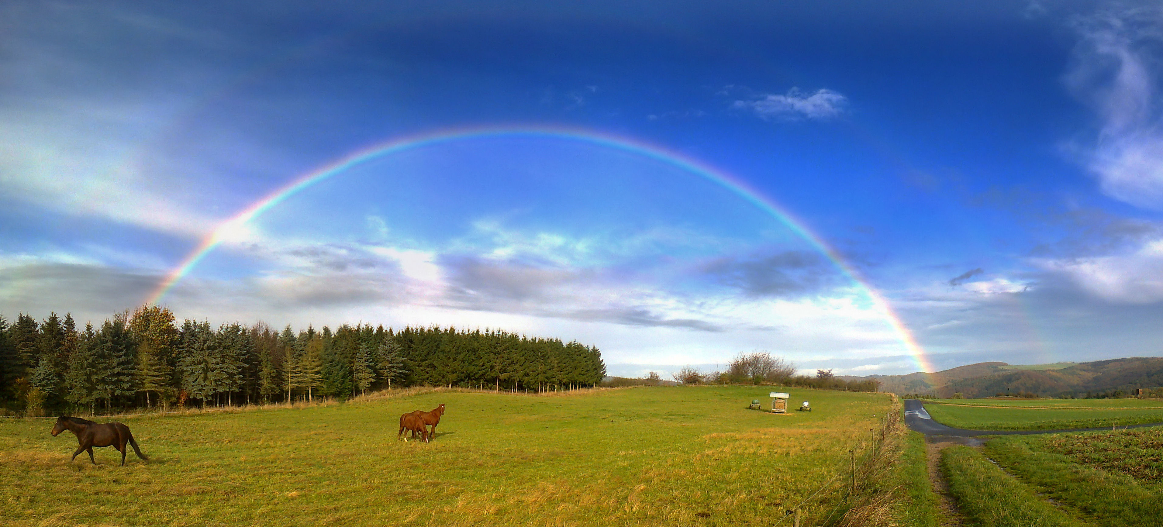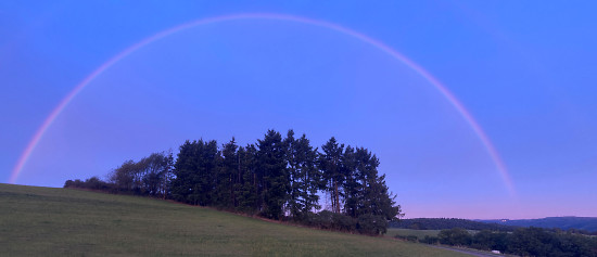 Ein Regenbogen über Sierscheid, das hinter diesen Bäumen liegt. Doch kann einem auch schnell mal der Himmel auf den Kopf fallen. Schönwetterwolken mit einer wunderbaren Fernsicht bieten rundum die schönsten Fotomotive.