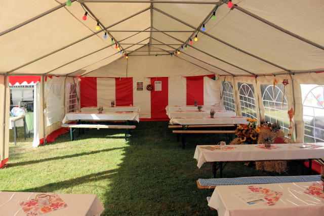 Die Zeltdekoration ist herbstlich gehalten, obwohl es draußen noch sommerlich warm und sonnig ist.