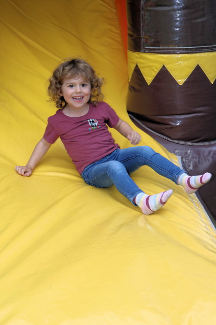 Kinder auf der Hüpfburg herumtoben.