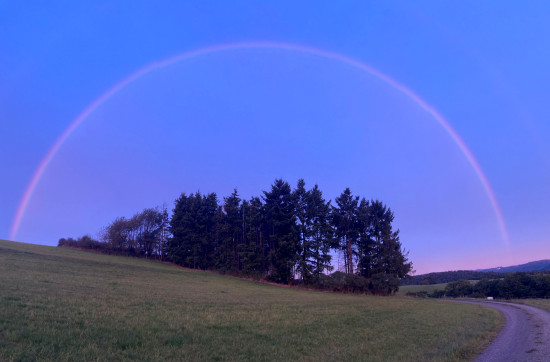 Ein Regenbogen über Sierscheid, das hinter diesen Bäumen liegt. Doch kann einem auch schnell mal der Himmel auf den Kopf fallen. Schönwetterwolken mit einer wunderbaren Fernsicht bieten rundum die schönsten Fotomotive.